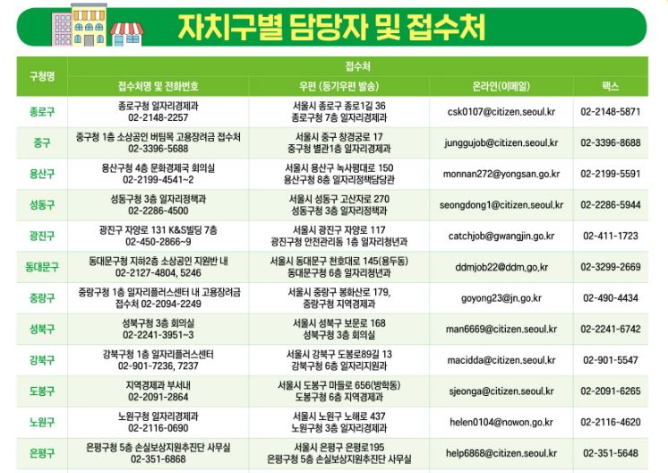 접수 방법은 현장, 이메일, 팩스와 우편입니다. 아래 자치구별 접수처가 나와 있으니 확인하고 접수 바랍니다.