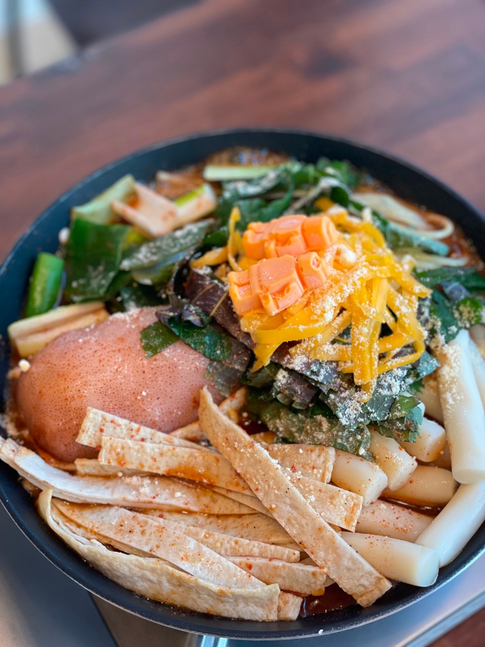 떡볶이 위에 데코로 레고 모양의 귀여운 치즈가 있었습니다.