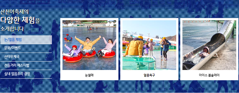 대한민국 대표축제, 산천어체험, 얼음낚시, 눈/얼음체험, 문화/이벤트, 선등거리, 세계최대실내얼음조각광장