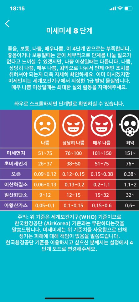 미세미세에서는 미세먼지 농도가 4단계가 아니라 8단계로 알려줍니다. 세부적인 농도를 알고 피해야할 때는 꼭 피해야 하는 것입니다. 여기에서는 나쁨, 매우 나쁨이 아니라 나쁨, 상당히 나쁨, 매우 나쁨, 최악으로 나뉩니다.