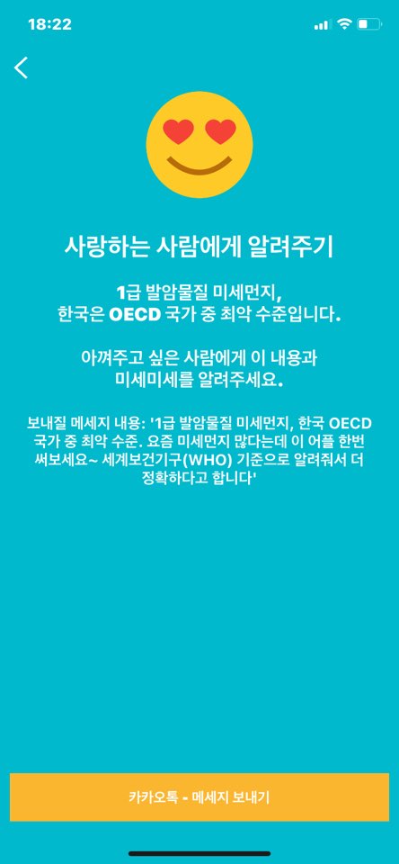 오른쪽 상단에 지도를 누르면 대한민국 전국의 미세먼지 농도를 확인할 수도 있으며 왼쪽 상단을 누르면 사랑하는 사람에게 메시지로 알려줄 수도 있으니 지금 같은 시기에 가족들과 친구들에게 꿀팁을 알려주시기 바랍니다.